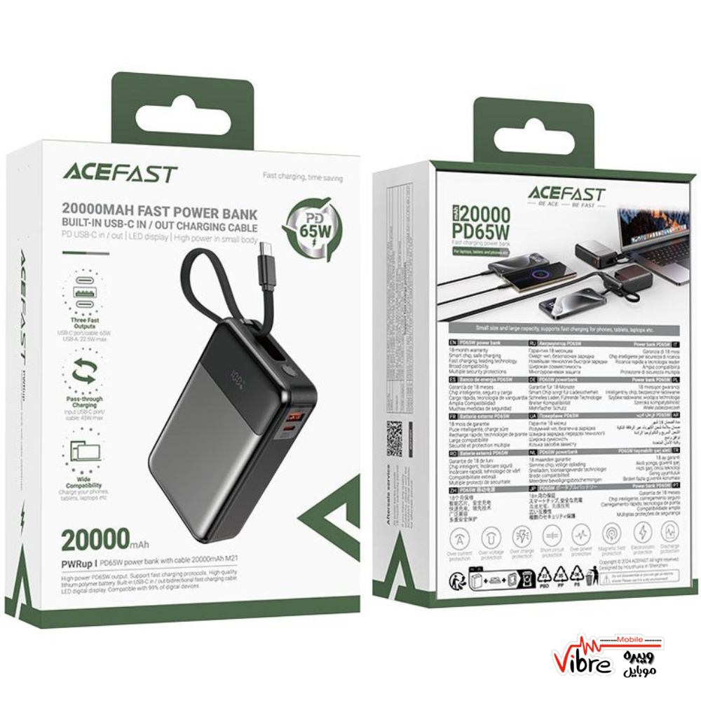پاوربانک ACEFAST M21 PD 65W 20000mAh با ظرفیت بالا، پشتیبانی از شارژ سریع و درگاههای متعدد، انتخابی قدرتمند و کاربردی برای شارژ سریع گوشی، تبلت، لپتاپهای کوچک و گجتهای مختلف در سفر، محل کار و استفاده روزمره است.