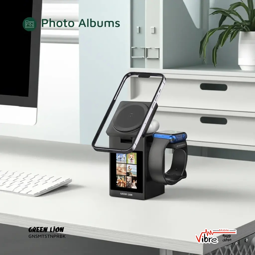 استند شارژر بیسیم گرین لاین با صفحه نمایش LCD و بلندگو مدل Green Lion Smart Station Pro LCD Wireless Charger with Speaker